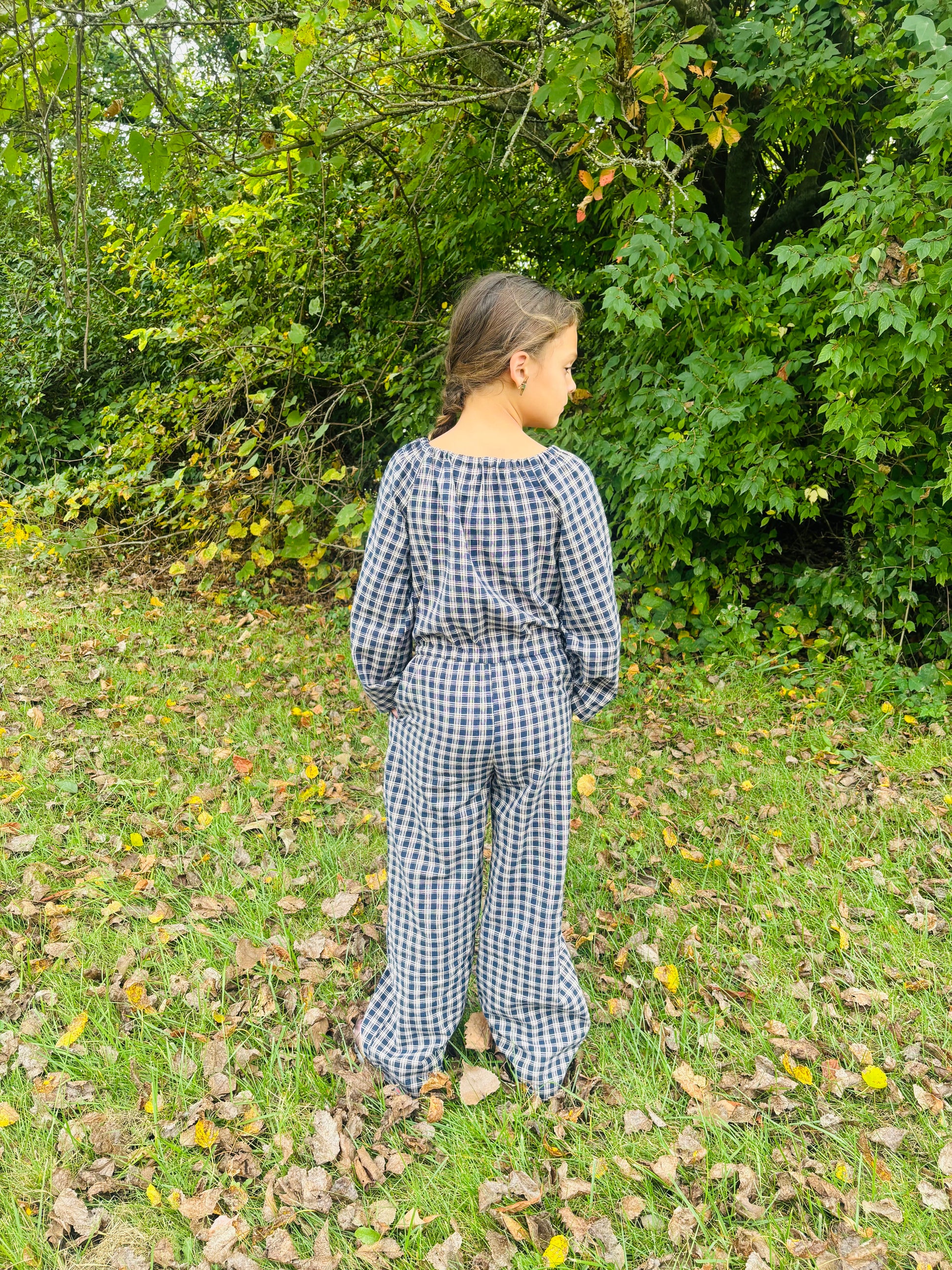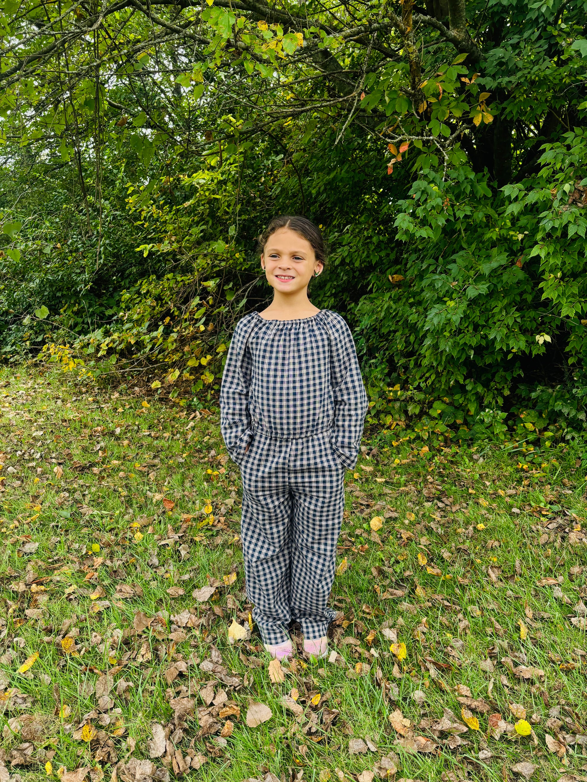 This romper blends rustic charm with everyday comfort. Made from lightweight cotton gingham in deep navy and beige, it’s perfect for crisp fall adventures or cozy gatherings. The elastic neckline and waist make it easy to wear, while the roomy pockets are perfect for keeping treasures close at hand. Breathable yet warm enough for layering, it’s a versatile piece that works beautifully on those in-between autumn days.